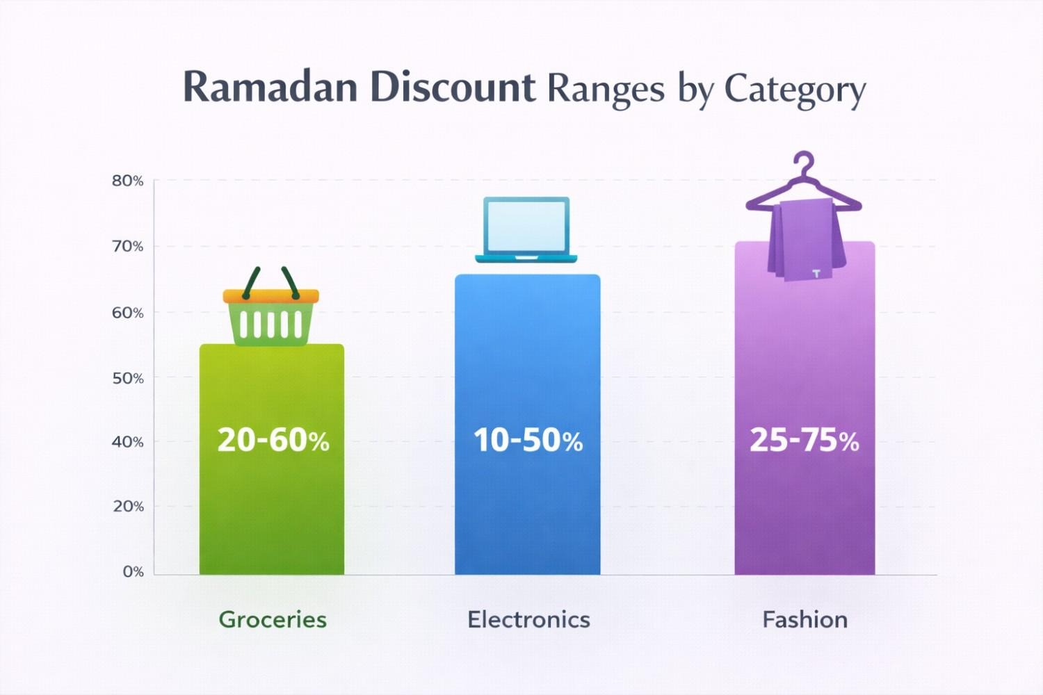 We analysed Ramadan 2023–2025 discount patterns across 50+ UAE retailers and early 2026 previews to map typical discount ranges and timing. Here's what shoppers can realistically expect by category: