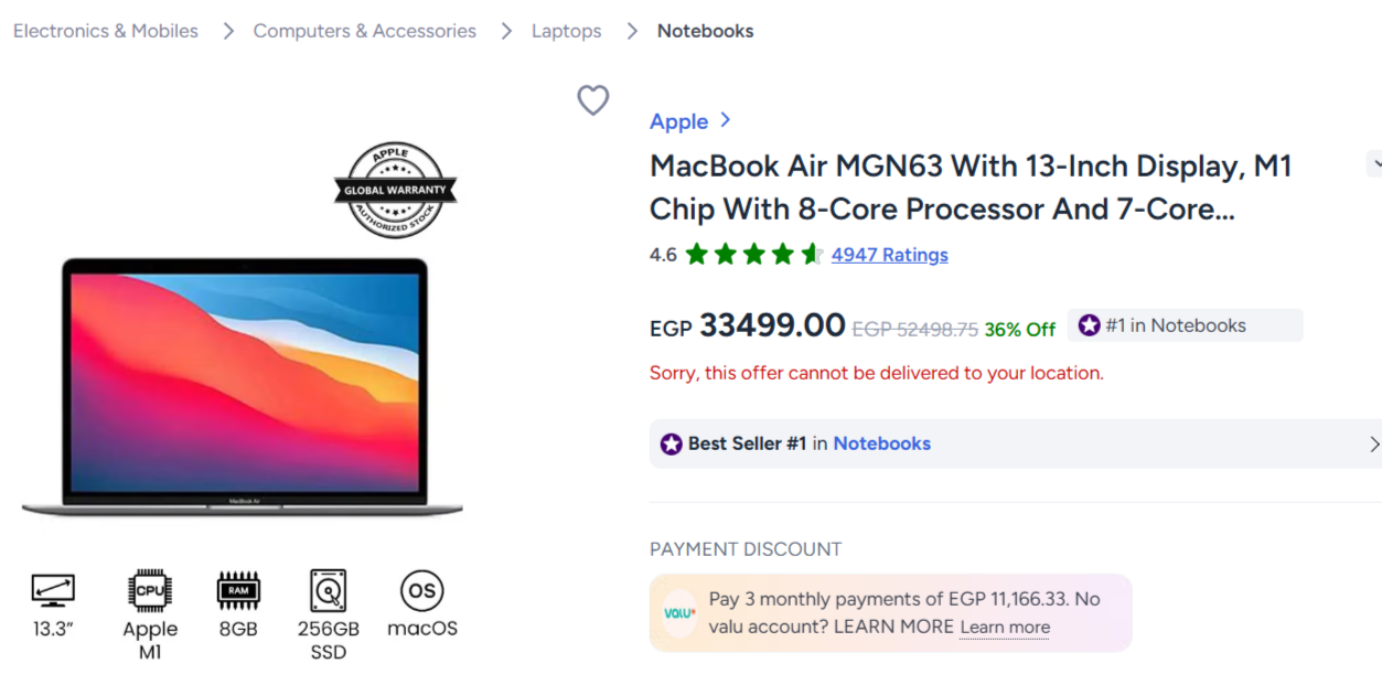سبب اختيارنا لهذا المنتج: تظل أجهزة MacBook من أكثر الحواسيب المحمولة مبيعًا على نون مصر، ويُفضلها الطلاب والمحترفون لتميزها في الاعتمادية والأناقة.