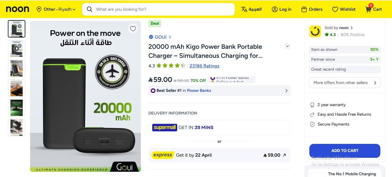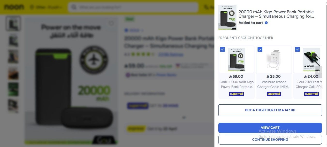 Go to Noon and search for 20000 mAh Kigo Power Bank, then added to the cart.